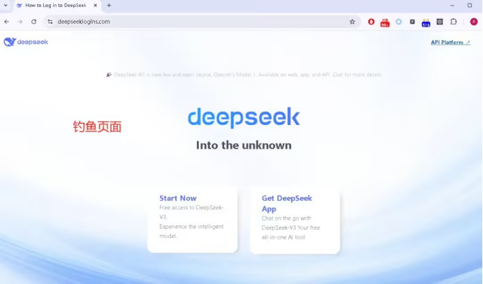以釣魚網(wǎng)站“https://deepseeklogins.com/”為例,其頁面結(jié)構(gòu)和風(fēng)格與 DeepSeek 官方網(wǎng)站高度相似,旨在通過偽造官方頁面來誘導(dǎo)用戶泄露敏感信息。與真實(shí)網(wǎng)站相比,釣魚頁面移除了中英文切換的超鏈接。在該釣魚頁面中,點(diǎn)擊右上角的“API Platform”鏈接將會引導(dǎo)用戶跳轉(zhuǎn)到偽造的登錄頁面。